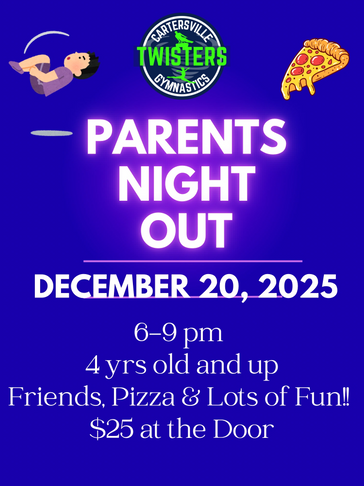 Parent's Night Out is for children ages 4-12 from 6 pm to 9 pm. The Cartersville Parks and Recreational Department and Cartersville Twister Booster Club alternate in hosting this event. Call the Gymnastics Center for more details and dates.